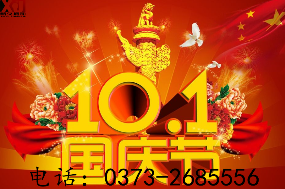 國慶節(jié)即將來臨,新鄉(xiāng)市新久振動機械有限公司全體員工祝福您,愿你:一笑煩惱跑,二笑憂愁消,三笑心情好,四笑不變老,五笑興致高,六笑幸福繞,七笑快樂到,八笑收入好,九笑步步高,十全十美樂逍遙。